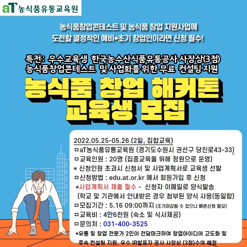 | 제목 | 농식품유통교육원 ‘농식품 창업 해커톤’ 교육생 모집(~5/16) | ||